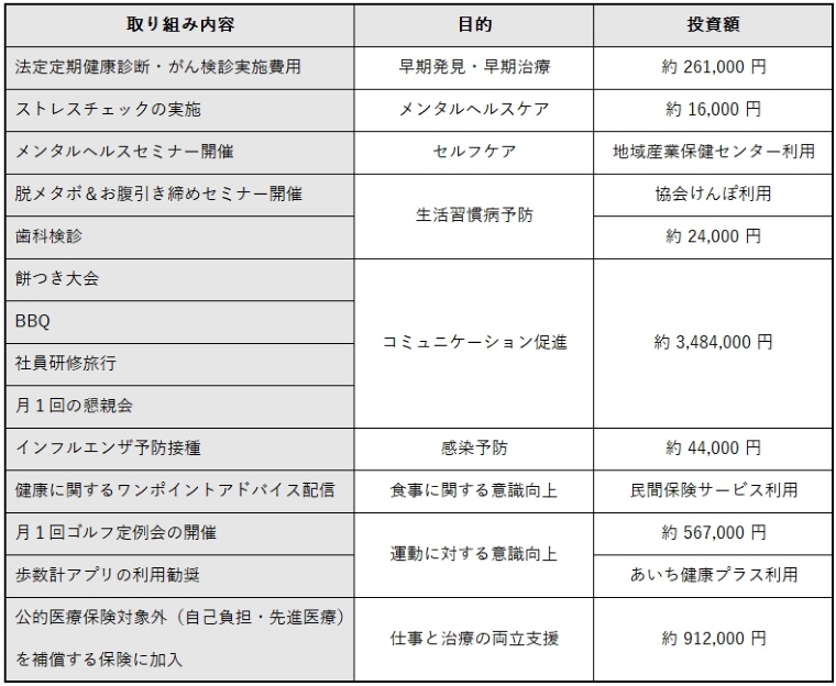 健康診断の結果、生活習慣病・メタボリックシンドロームのリスクが高い従業員に対し保健師による食事管理指導を実施し、2022年・2023年ともに減量に成功。対象者が特定保健指導(就業時間内での実施時間と場所の確保)を受けやすいよう支援を行う体制を整備し、案内を作成し従業員へ周知。