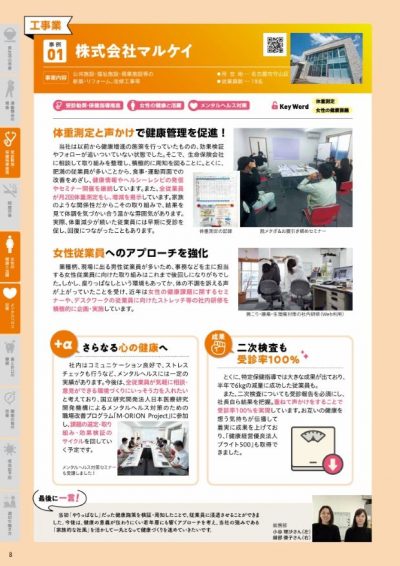 業種・規模・取組内容から探すことができ、愛知県内企業の実践例を通じて、元気な職場づくりのヒントが数多く紹介されており、当社でも健康づくりの参考資料として日頃から活用しています。