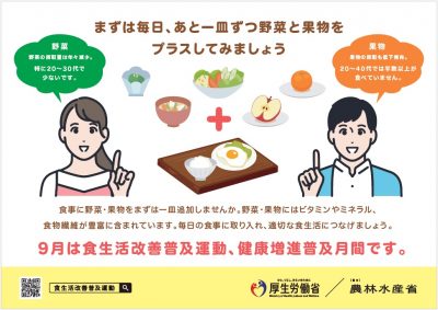 令和7年度は、「まずは毎日、あと一皿ずつ野菜と果物をプラス」を基本テーマとし、