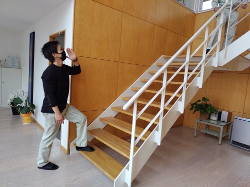1階から2階へ、大きな声で避難を呼びかけながら移動し、実際の状況を想定して行動します。