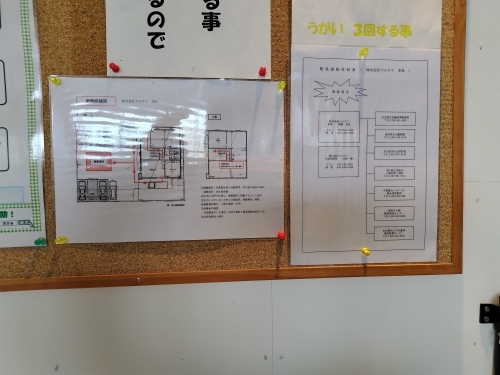 また社内には「避難経路図」「緊急時連絡体制表」を掲示し、緊急時の避難手順や避難経路、連絡先などについて改めて共有しました。