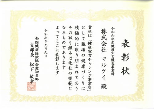全国健康保険協会 愛知支部様より、令和6年度健康宣言優良事業所として表彰されました!!