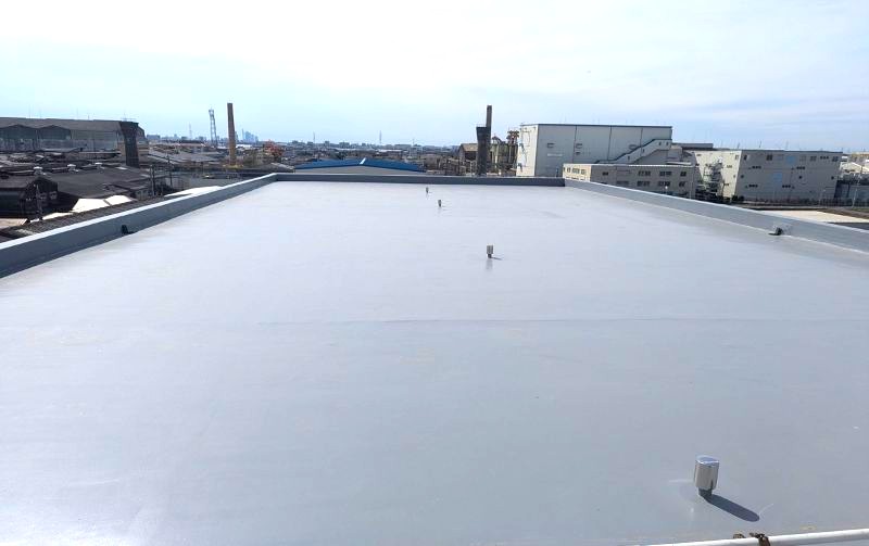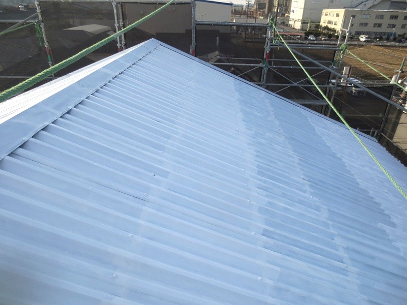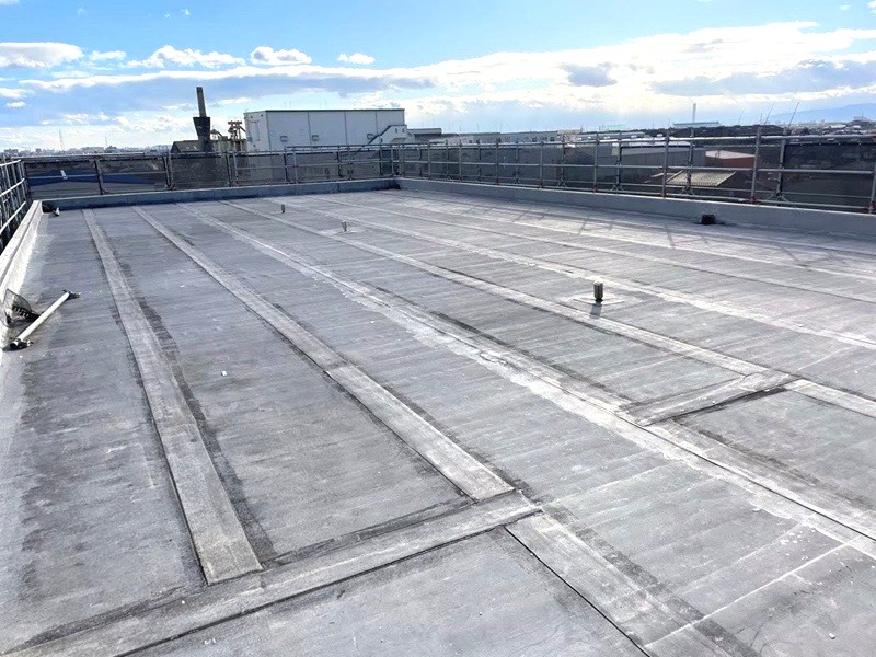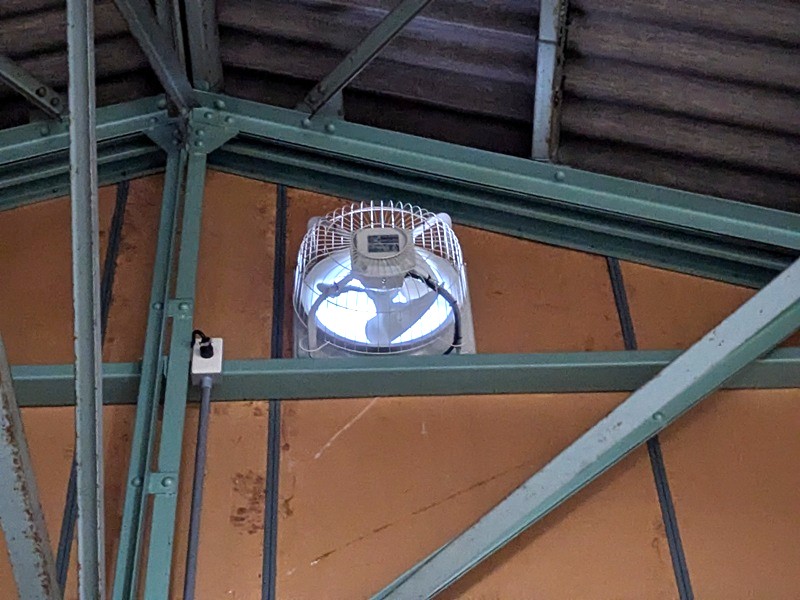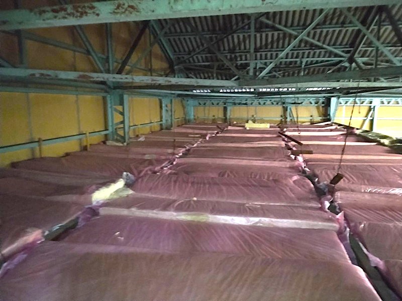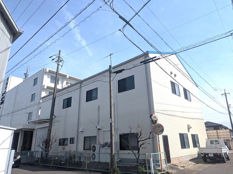 第三商品センター室内が大変暑いと言われ、室内を確認すると、2階天井裏に断熱材が無い事に気づき、2階天井に断熱材を敷き詰めました。また2階はほとんどが大屋根までの大空間になっており、熱くなった空気は換気口も無いところでこもっており、より一層室内を暑くしているので、屋根裏に換気扇を新たに設け、また屋根・外壁のトタンに遮熱塗材で仕上げ、室内の温度を下げる方法を提案し施工を行いました。